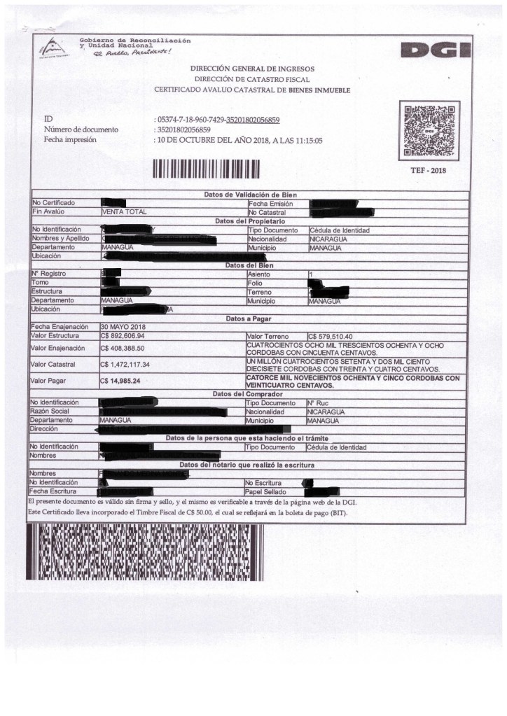 Ejemplo de certificado catastral en zona urbana, de bien inmueble localizado en el departamento de Managua. Certificado en base a la Ley General de Catastro Nacional (Ley No. 509).