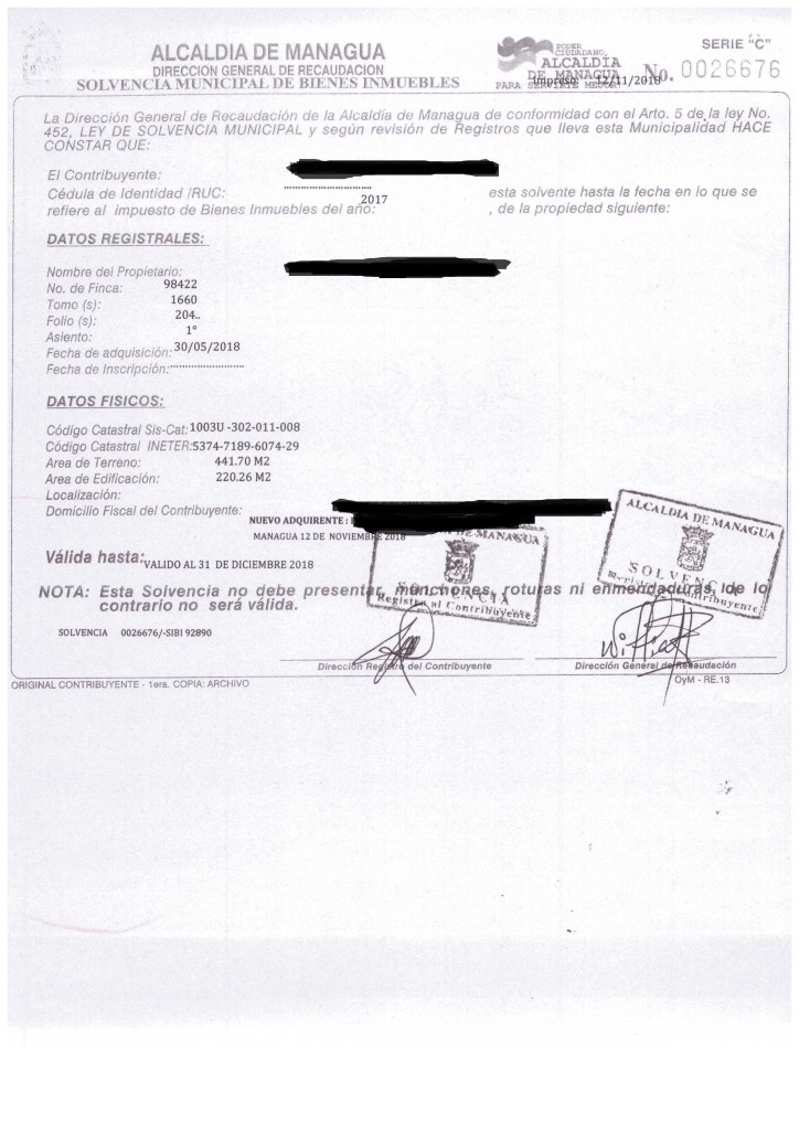 Les presento un ejemplo de solvencia municipal de bienes inmuebles, documento gestionado en base a la Ley No. 452 «Ley de Solvencia Municipal»